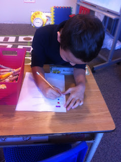 Avery is busy creating his own list of instructions for Eric using numbers, shapes, and colours.